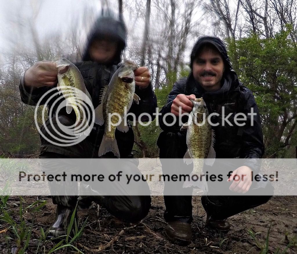 Notice the looks on our faces... smiling but as soon as we put the fish back in we were not smiling so much... wet and cold!!! But the fish were biting and biting very well. We caught lots of fish on seams and fast water areas, including tons of small largemouth. We have thus determined that all largemouth under 15 inches are in fact stupid.